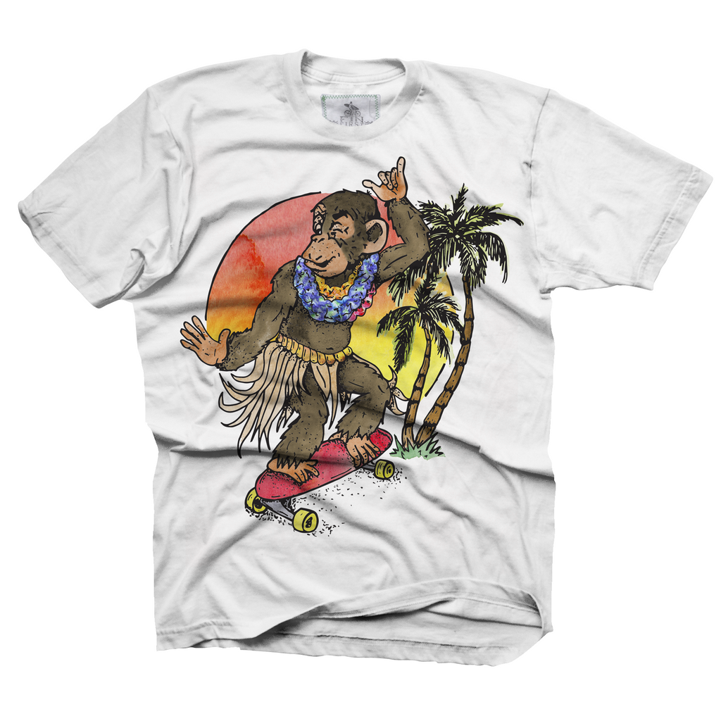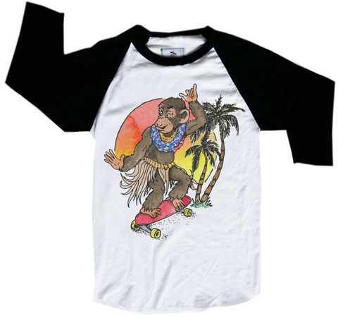 When our nephew made a special t-shirt design request, the hubby made his "monkey on a skateboard" vision come to life. Influenced by an old tiki bar sign from the 20's, the hubby used that as inspiration for the vibe of this watercolor.  This was intended to be a one of a kind piece but we loved it so much, we just had to share.