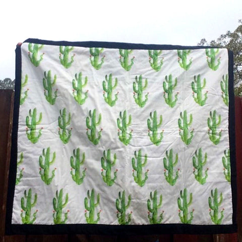 Our Siesta Blankets are handmade with love. Each blanket is 100% cotton with a black flannel backing. They have a comfy batting in the middle, sealed with our signature green zig zag stitch! These are the perfect size for kiddos. We recommend washing in cold water and drying on a low heat. Just like all of our products, every blanket will be made to order, custom made just for you, by the sweetest local grandma in town. She takes pride in every little blanket like it's her own! This blanket is intended for {kiddos} cuddling on the couch, jazzing up their little teepee, road trips, stuffed animal picnics, nap time and tummy time.  If you don't see the design you'd like, just ask us in the notes section!  They now come in two sizes.