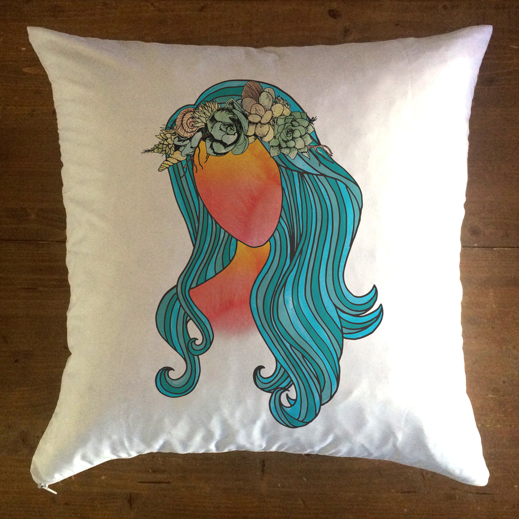 Sometimes we revamp older designs, just because we can! While we still carry our pink haired Adjust Your Sails breast cancer awareness design, we wanted to give this little hand drawn lady a twist. We wanted shades of teal for her wave-like hair, a gorgeous sunset for her face (if you all know the hubby, he doesn't draw faces) and lastly she needed a flower crown, adorned with succulents and seashells from our personal collection. Her name is Delmara, and her name means "of the sea". We hope you love her!