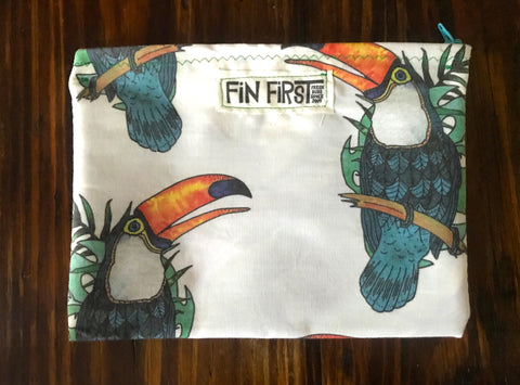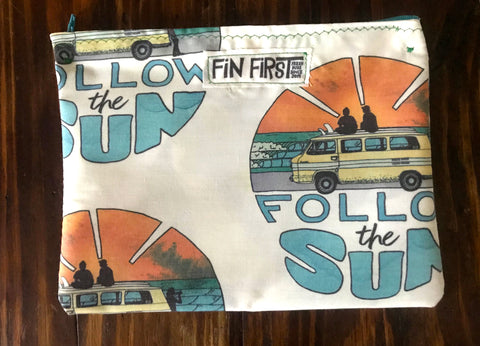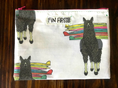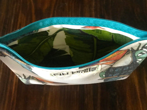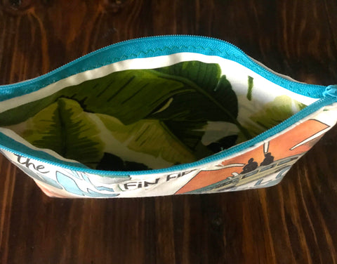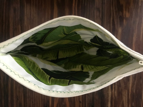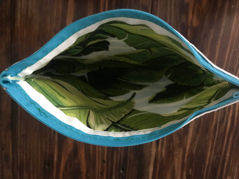 The perfect catch-all zipper pouch is here!! Each bag is the perfect size at approximately 8” x 9”. Locally handmade. The outside designs are watercolored (in house by us) and each pouch sports a sturdy banana leaf inner layer. Zipper colors vary.